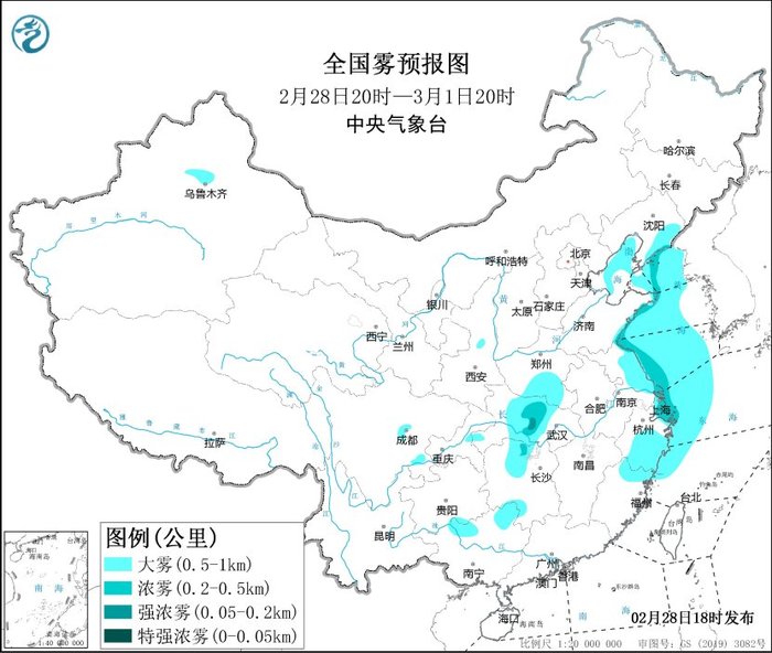 估计,2月28日夜间至3月1日白日,渤海、渤海海峡、黄海大部海域、东海西部海域的部分海域、烟大航线公里的大雾,杭州湾邻近海域、长江口邻近海域、舟山群岛邻近海域、山东半岛沿岸海域、辽东半岛沿岸海域、江苏沿岸海域、浙江东北部沿岸海域、青岛港、日照港、连云港、上海港、宁波港的部分地区有能见度缺乏500米的浓雾。此外,2月28日夜间至3月1日上午,河南南部、湖北中部、湖南北部、江苏东部、浙江中南部、福建北部等地的部分地区有能见度低于1公里的大雾气候,其间,湖北中部、湖南北部等地的部分地区有能见度低于500米的浓雾,局地有能见度低于200米的强浓雾。